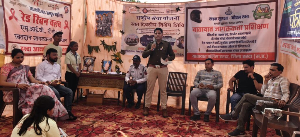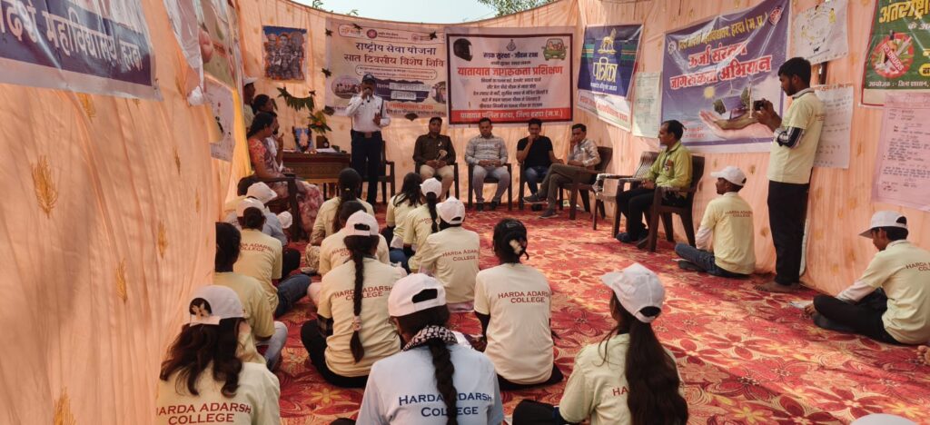हरदा / हरदा आदर्श महाविद्यालय हरदा की राष्ट्रीय सेवा योजना इकाई द्वारा आयोजित सात दिवसीय विशेष आवासीय शिविर के षष्ठम दिवस की शुरुआत शुक्रवार को प्रभात फेरी की साथ की गई। इसके बाद परियोजना कार्य के अंतर्गत विद्यालय परिसर एवं पंचायत भवन के पास वृहद रूप से स्वच्छता अभियान चलाकर श्रमदान किया गया। इस दौरान पहले से लगे पौधे एवं नए रोपित किए गए पौधों के थाला बनाये गये। बौद्धिक सत्र में जागरूकता कार्यक्रम के अंतर्गत स्वयंसेवकों को साइबर सुरक्षा, सड़क सुरक्षा तथा नशा मुक्ति के प्रति जागरूक किया गया।