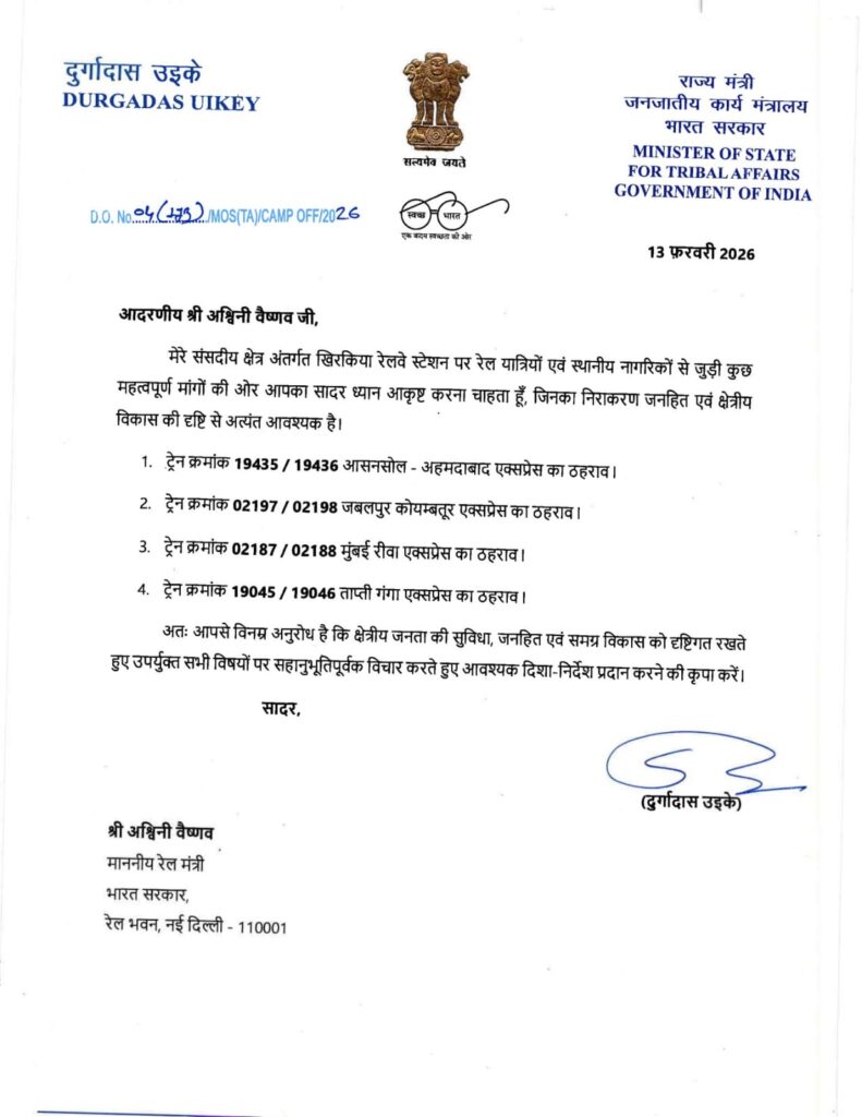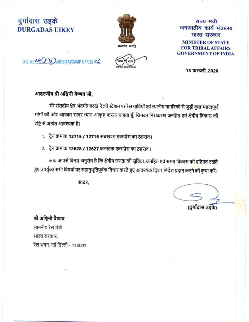 श्री उइके ने केंद्रीय रेल मंत्री श्री अश्विनी वैष्णव के समक्ष हरदा, खिरकिया, टिमरनी एवं छनेरा रेलवे स्टेशनों पर प्रमुख ट्रेनों के ठहराव की वर्षों से लंबित मांग को भी गंभीरता से रखा। श्री उइके ने कहा कि ये सभी स्टेशन जनजातीय, ग्रामीण एवं कृषि-प्रधान क्षेत्रों से जुड़े हुए हैं, जहां से बड़ी संख्या में किसान, श्रमिक, विद्यार्थी, नौकरीपेशा लोग एवं व्यापारी प्रतिदिन यात्रा करते हैं। लेकिन पर्याप्त ट्रेनों के ठहराव के अभाव में यात्रियों को अन्य बड़े स्टेशनों तक निर्भर रहना पड़ता है, जिससे समय, धन और श्रम तीनों की हानि होती है। उन्होंने हरदा रेलवे स्टेशन पर सचखंड एक्सप्रेस एवं कर्नाटक एक्सप्रेस के ठहराव की मांग रखते हुए कहा कि यह स्टेशन क्षेत्रीय व्यापार एवं आवागमन की दृष्टि से अत्यंत महत्वपूर्ण है।