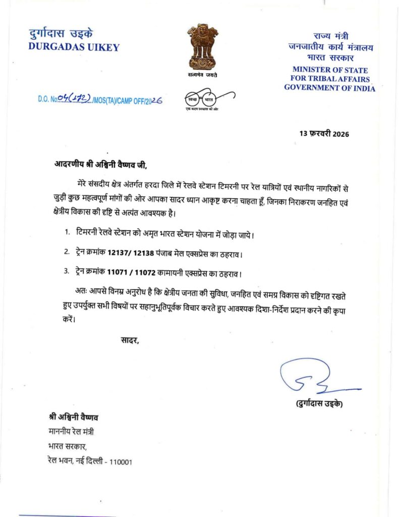 हरदा, खिरकिया, टिमरनी, छनेरा स्टेशनों के स्टॉपेज को लेकर भी उठाई मजबूत मांग